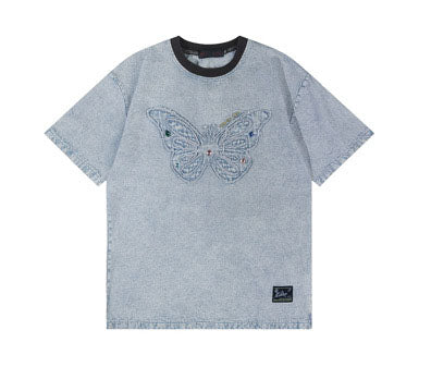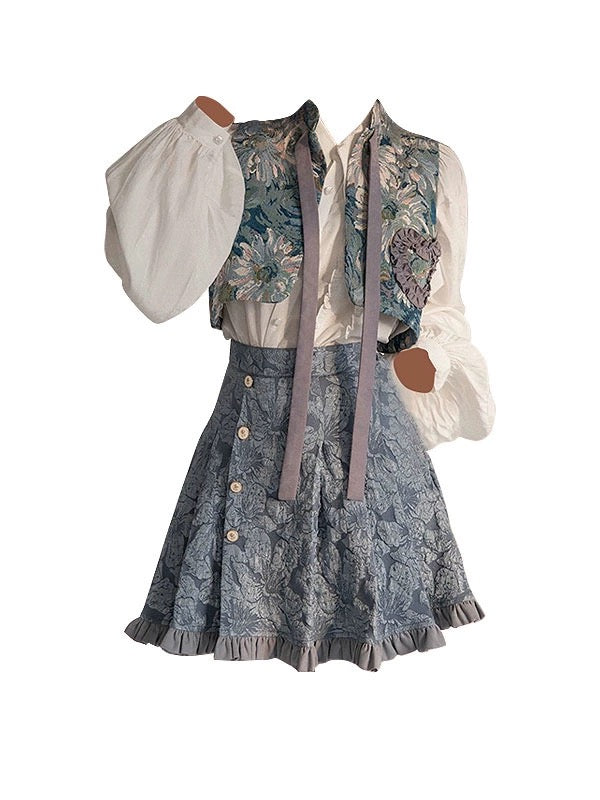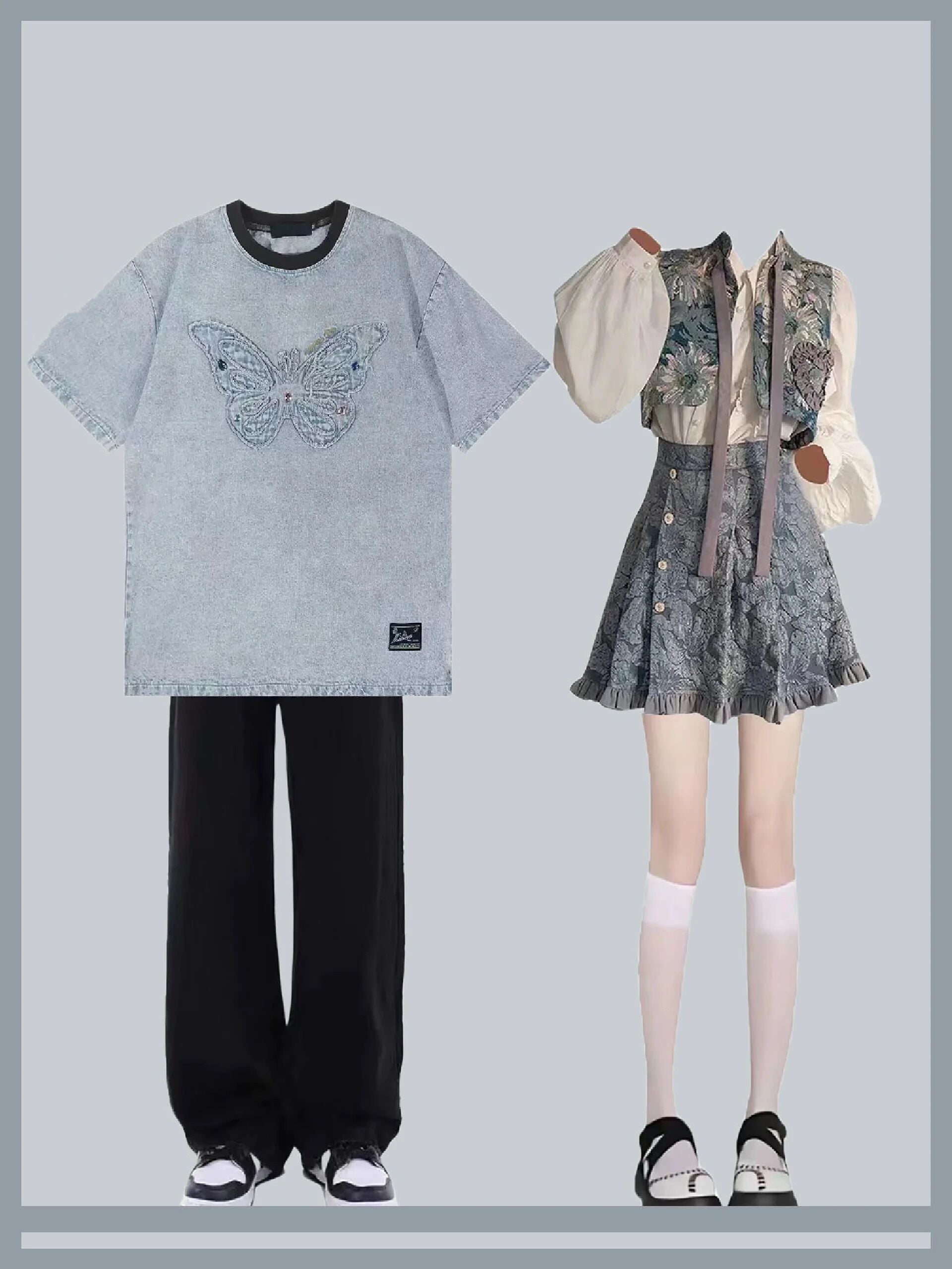 香港風復古刺繍蝶oversizeゆったり半袖Tシャツ/フランス復古国風ジャカードデザイン感覚花柄ベスト長袖シャツスカートセットスカート2023新作番号ZT299