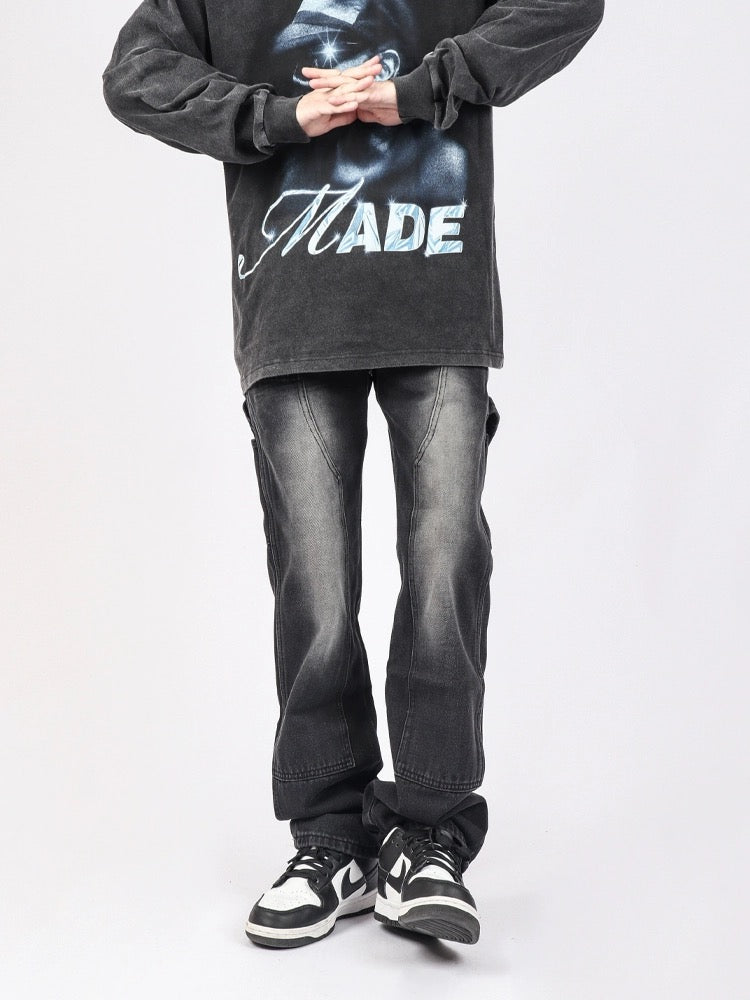 アメリカ風復古プリントパーカーヒップホップでゆったりコーディネート自在カジュアルコート/ハイストリートアメリカンゆったりストリートウォッシュ加工グラデーションブラックストレートジーンズ番号ZT390