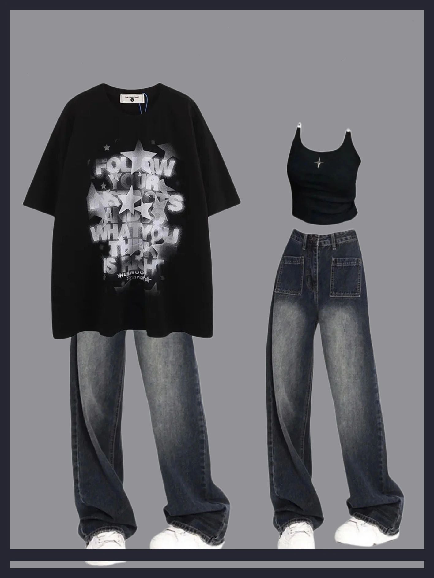 2023星柄プリントアメリカンヴィンテージ半袖oversizeカップル半袖Tシャツ夏/夏ブラックキャミソールタンクトップ女性セクシースリムショートタイプタイトなインナー甘ギャル風/2023年新作着痩せハイウエストワイドレッグパンツ番号ZT349