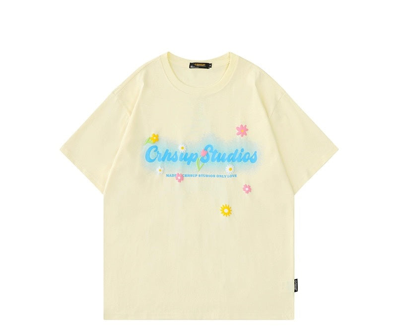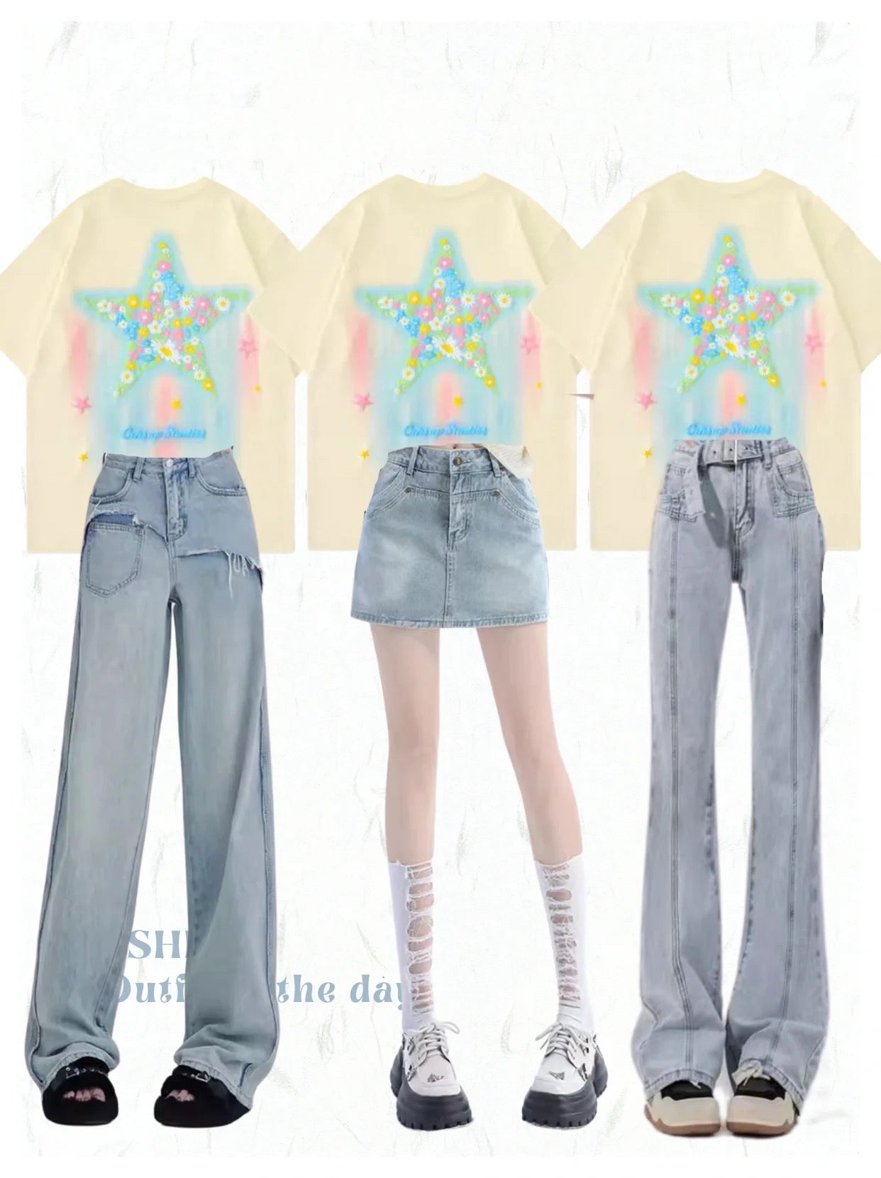 insドーパミン夏の半袖Tシャツカラフルな星の落書きchic港風男女カップルトレンドカードラウンドネック半袖番号ZT371
